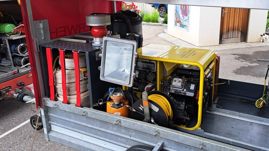 Zusätzlich steht auch noch ein Notstromaggregat, eine Tauchpumpe, sowie Schlauchmaterial und Beleuchtungsmittel zur Verfügung.